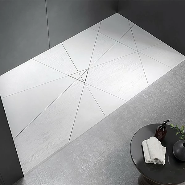 A combination of textures that create the stunning SMART QUIZ shower tray which has a drain hidden in the centre, with a grating that is fully integrated into the shapes of the shower tray.